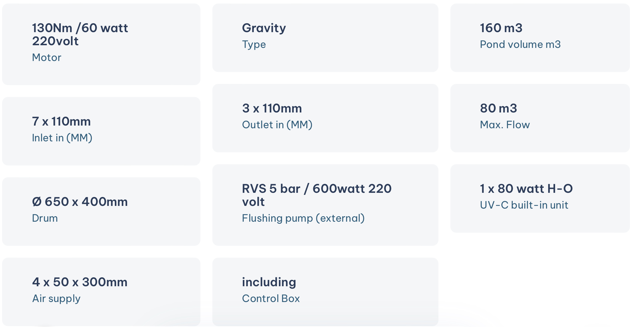 Biomedie og eller japanmatter er ikke inkludert i prisen, da det er litt forskjellige valgmuligheter her. Skulle vi foreslå, ville valget være T24 i første del etter trommel og japanmatter i siste kammer. Dette for å fin polere vannet så det blir fjellvann kvalitet. Vi kan tilby en pakkepris på 300 liter biomedie T24 + japanmatter i siste kammer for 4000kr
