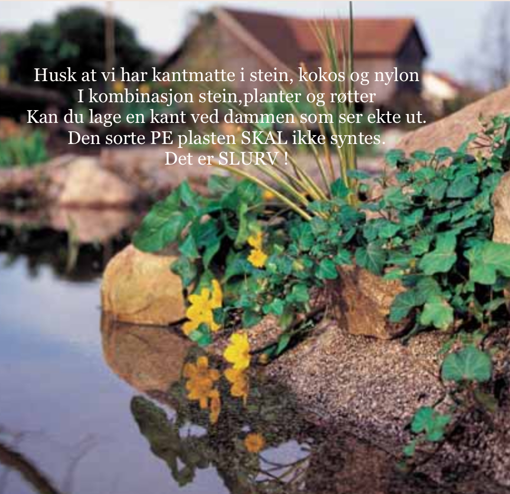 Vi har også tank og foliegjenomføring og bunn/sidedren samt rør og deler, så du kan føre vann ut og inn av dammen under vannlinja. Da slipper du synlige slanger over kanten. Men du skal huske at vi bor i Norge og telen kan fryse istykker rør og koblinger om du ikke har gjort noen tiltak før vinteren.