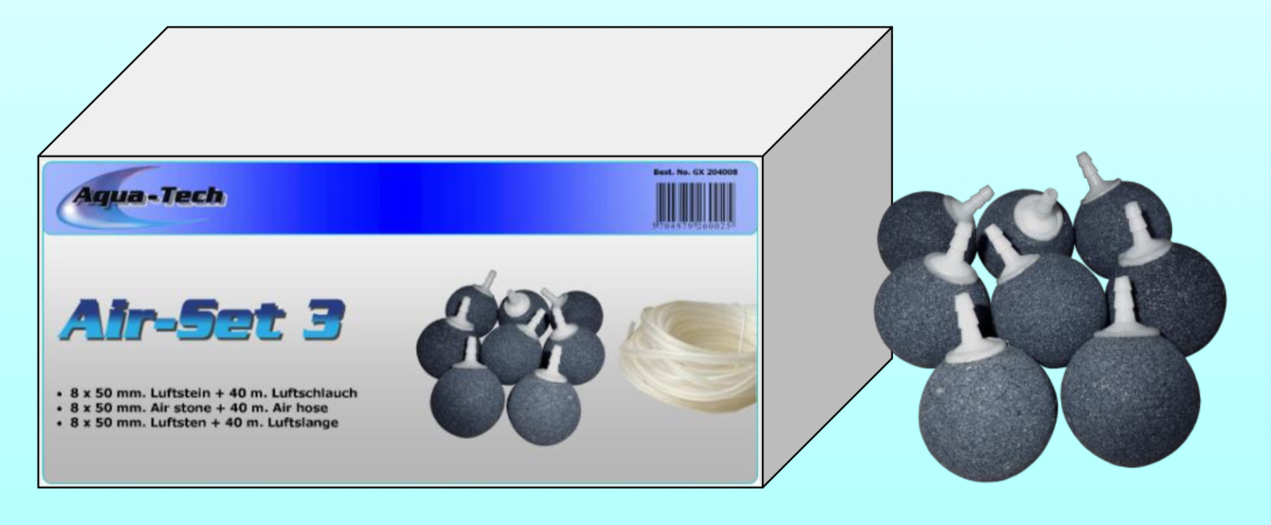Air-set 3 inneholder 8 luftestein i Ø50mm + 40 meter luftslange 4mm innvendig ( vanlig luftslange akvarie )