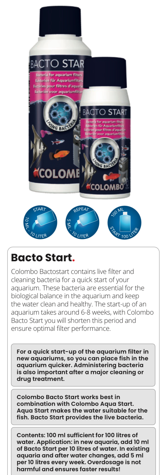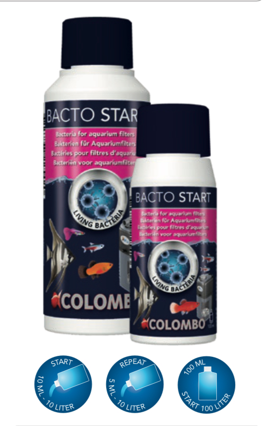 Colombo Aqua Start fjerner klor og beskytter fisken. Bytting av vannet endrer den biologiske balansen som kan føre til helseproblemer hos fisk. Bruk av Colombo Aqua Start forhindrer disse problemene og gjør springvann egnet for fisk.