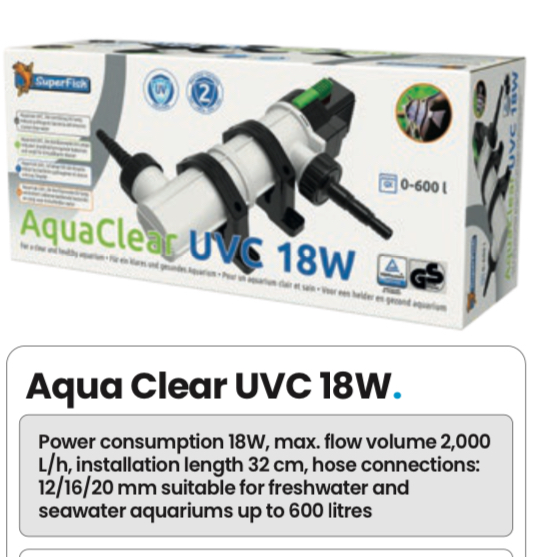 Uv-C lys eller Uv steriliserer er kjent for å drepe svevealger ( grønt vann ) men for denne akvariemodellen der vannet passerer sakte, vil den også sterilisere en stor mengde bakterier, parasitter og virus.