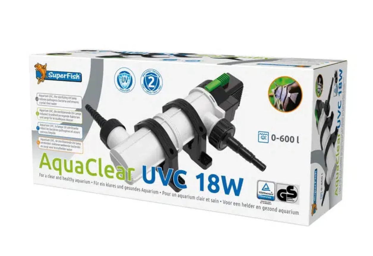 Uv-C lys eller Uv steriliserer er kjent for å drepe svevealger ( grønt vann ) men for denne akvariemodellen der vannet passerer sakte, vil den også sterilisere en stor mengde bakterier, parasitter og virus.