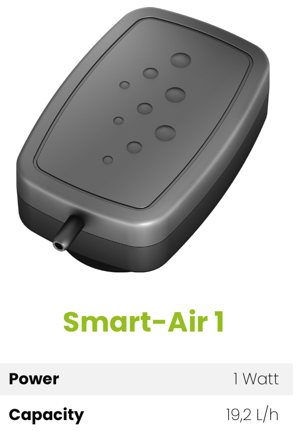 Smart-Air er verdens mest innovative og stillegående luftpumpe. Nå kan du nyte akvariehobbyen din uten irriterende støy siden støynivået kun er 38 dB. Smart-Air 1 har ett uttak, Smart-Air 2 har to uttak. Begge luftpumpene er spesielt energieffektive