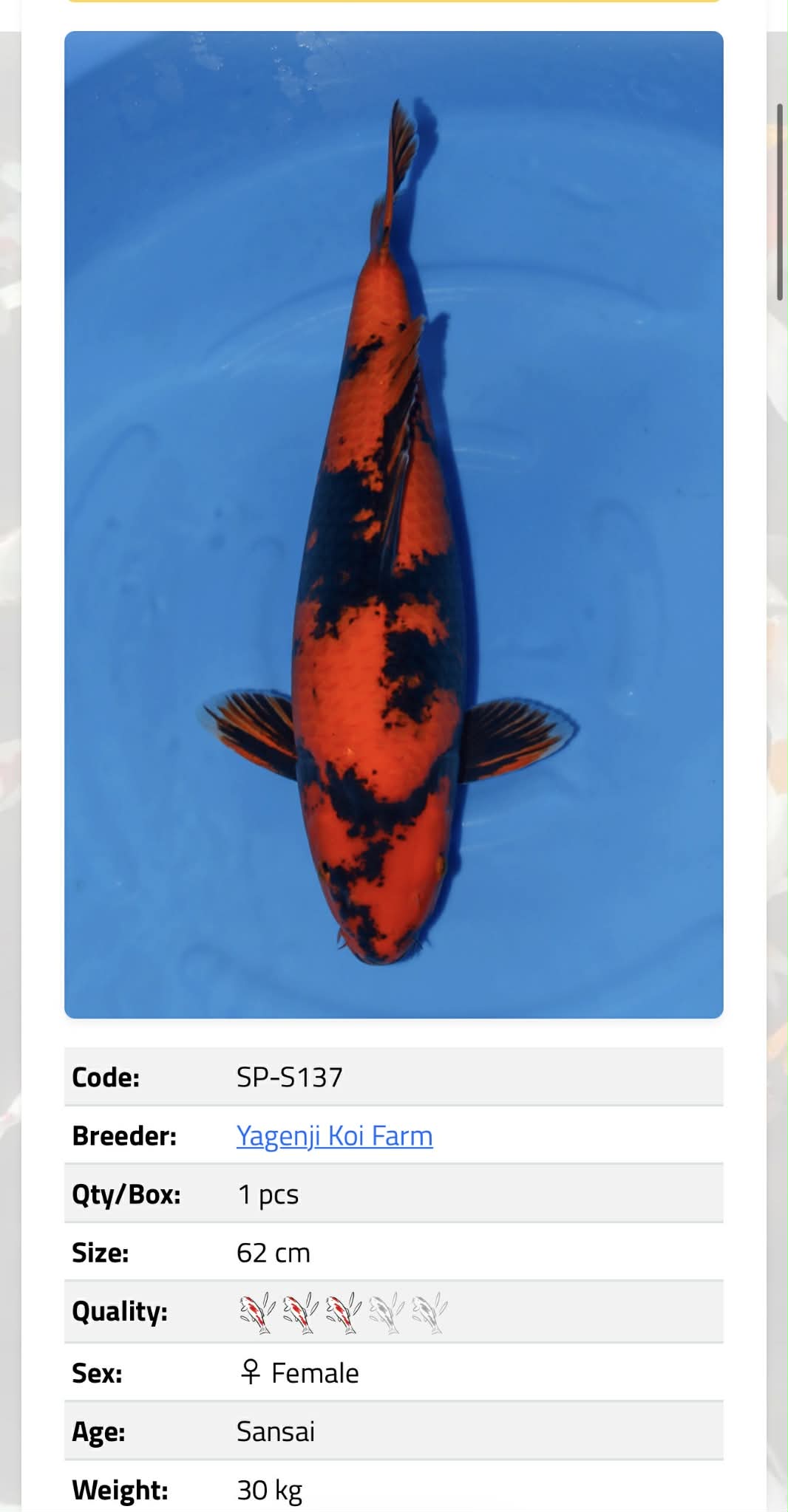 Hunn fisk 62cm av høy kvalitet . Sertifikat fra oppdretter følger fisken.