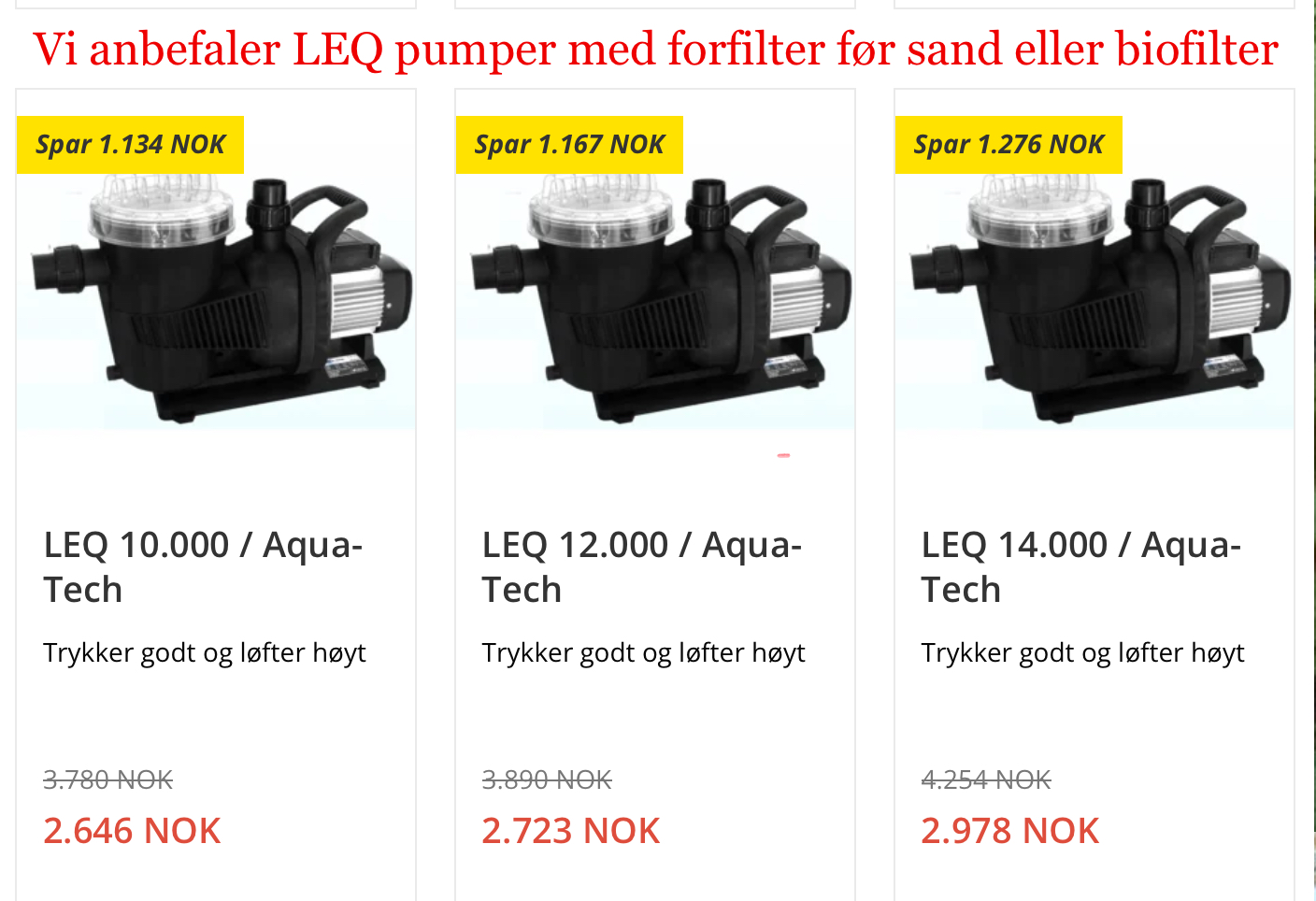 Vi anbefaler pumpe med forfilter til alle sandfilter og har lagerført kraftfulle LEQ pumper fra Aqua-Tech til meget god pris , se link