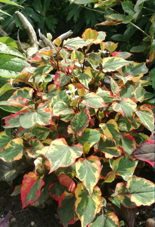 Liten plante med hjerteformede blader som er grønne med røde og gule tegninger. Kommer med mange hvite blomster, hvor frøknoppen kan ligne en kongle. Trives i full sol eller halvskygge. Voksedybde 5- 0cm. Blomstring Juni- August.
