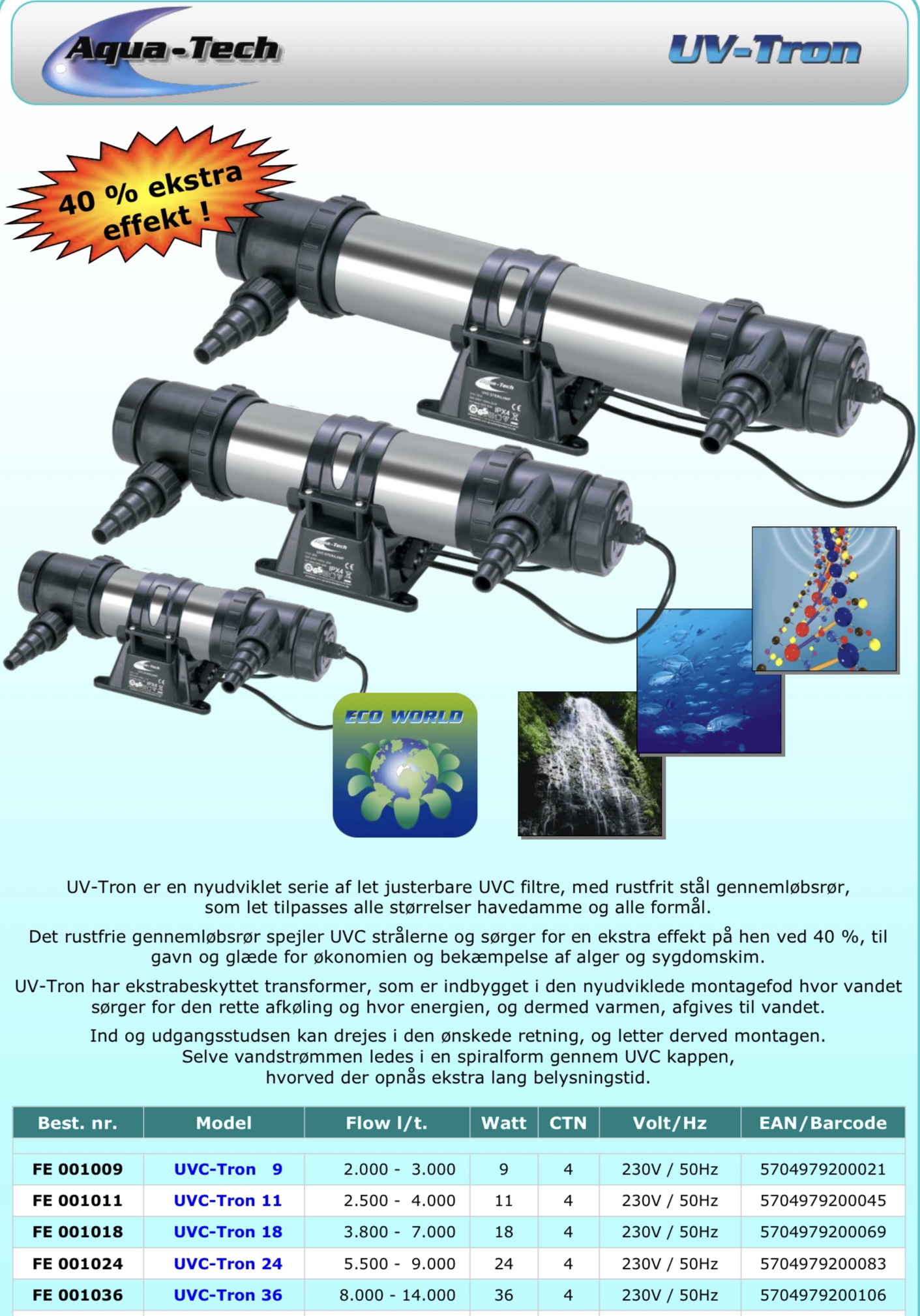 Vi anbefaler minemum 3watt Uv-C pr 1000 liter vann og 50% av vannmengden i dam må passere Uv-C lyset pr time .