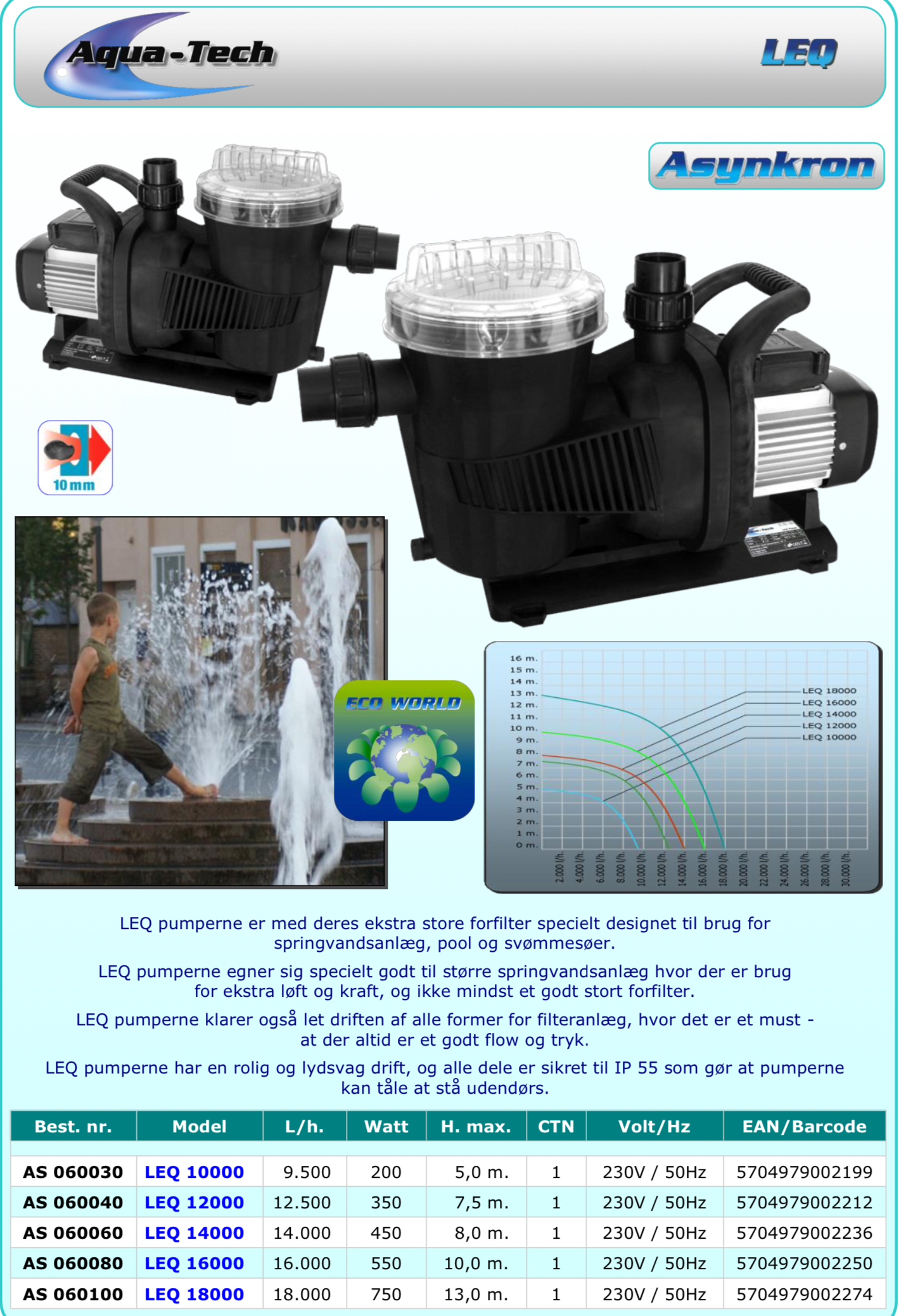 LEQ pumper løfter høyt, se diagram, men vær oppmerksom på at alle pumper som trykker godt har høyere strømforbruk.