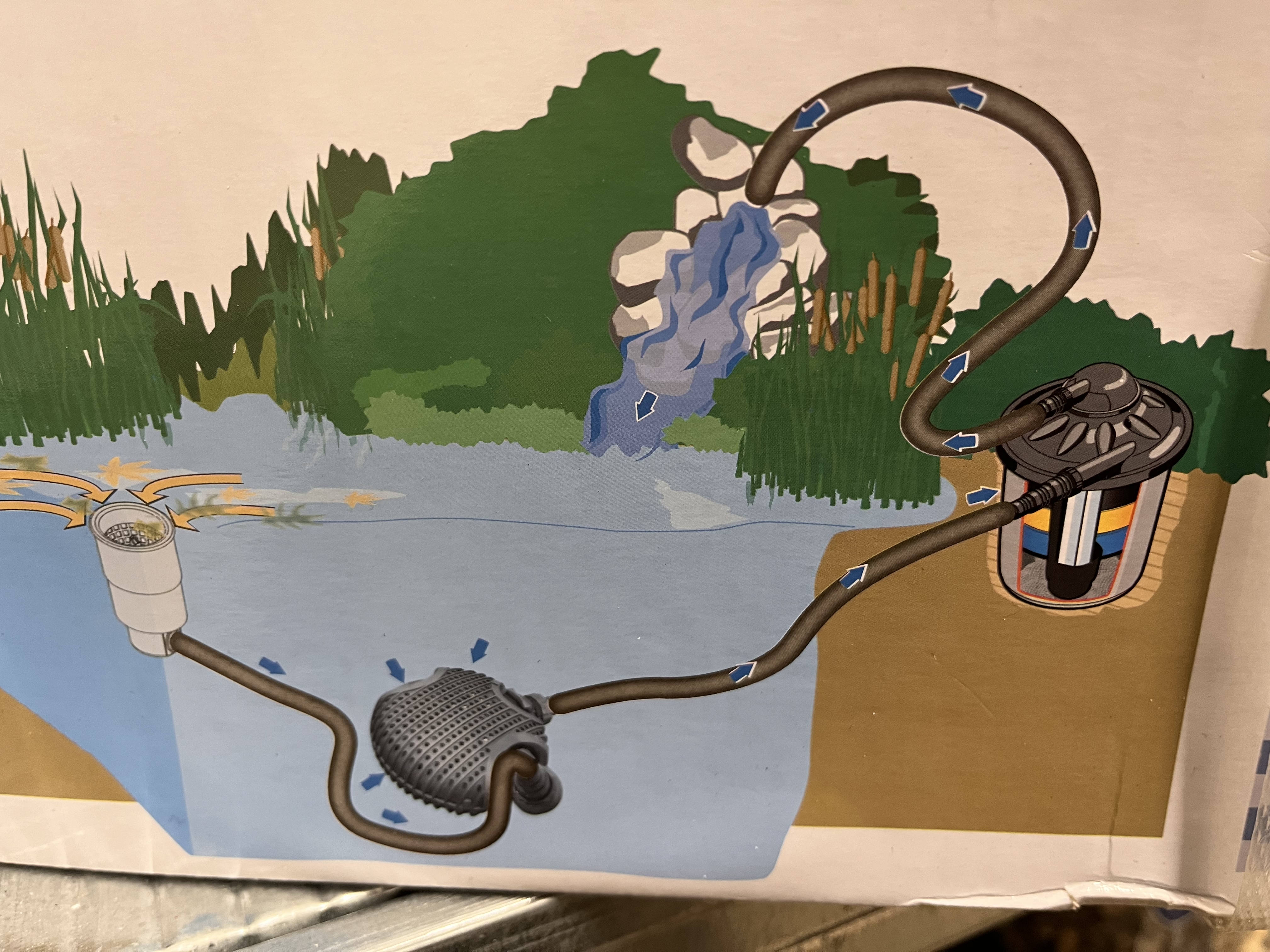 Du kan benytte slange til et rolig felt i dammen eller dersom du har to dype kulper vann bør hentes fra. Eller du kan koble innsug 2 mot en skimmer.